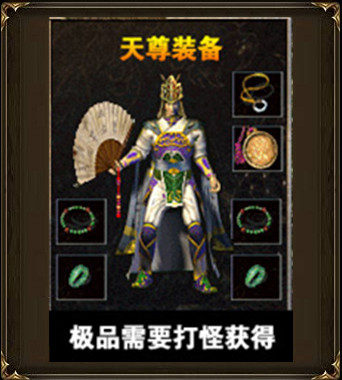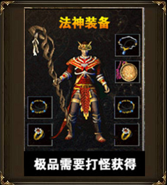 【装备简介】:商店装-沃玛装-祖玛装-赤月装,武器屠龙、嗜魂法杖、赤血魔剑为终极武器,增加钻石斗笠、特修面巾、四格装备
